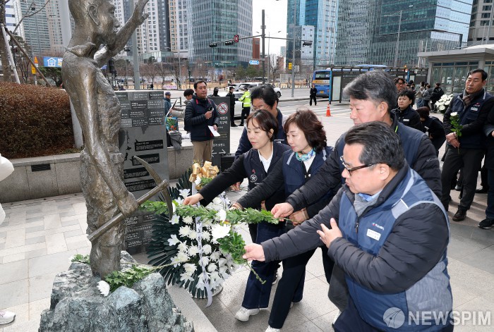 [서울=뉴스핌] 정일구 기자 = 민주노총과 한국노총 등 양대노총 조합원들이 27일 오전 서울 용산구 용산역 강제징용 노동자상 앞에서 열린 3.1운동 107주년 강제징용 노동자상 합동 참배 기자회견에서 헌화하고 있다. 2026.02.27 mironj19@newspim.com