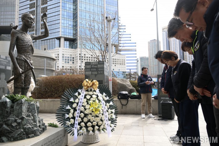 [서울=뉴스핌] 이건주 인턴기자 = 3.1운동 107주년을 앞둔 27일 오전 서울 용산역 광장 강제징용 노동자상 앞에서 양대노총 관계자들이 합동참배를 하고 있다. 2026.02.27 kunjoo@newspim.com