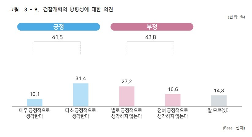 수사·기소 분리라는 검찰개혁 방향에 대해 시민들은 '중대범죄 대응 역량 약화'(28.9%)와 '사건 처리 지연'(27.1%)을 크게 우려하는 것으로 조사됐다.
