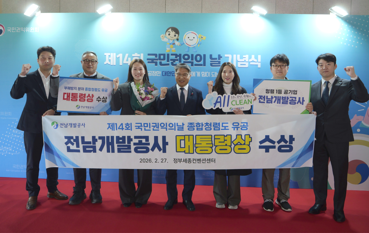 [무안=뉴스핌] 조은정 기자 = 전남개발공사가 27일 정부세종컨벤션센터에서 열린 '제14회 국민권익의 날' 기념식에서 부패방지 부문 최고 영예인 대통령 표창을 수상했다고 밝혔다.