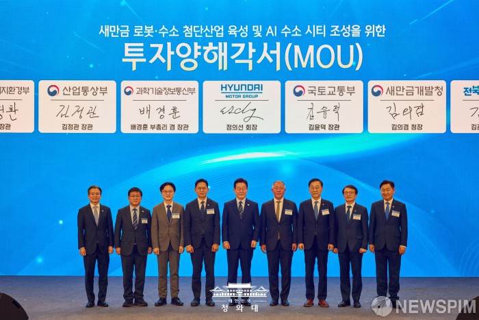 [서울=뉴스핌] 이재명(왼쪽 다섯번째) 대통령이 27일 전북 군산 새만금컨벤션센터에서 열린 새만금 로봇·수소·인공지능(AI) 시티 투자협약식에 참석해 투자양해각서 체결식을 축하하고 있다. 이 대통령의 오른쪽이 정의선(여섯번째) 현대자동차그룹 회장. [사진=청와대] 2026.02.27 photo@newspim.com