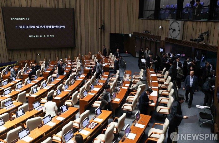 [서울=뉴스핌] 윤창빈 기자 = 27일 오후 서울 여의도 국회에서 열린 본회의에서 법원조직법 일부개정법률안(대안)이 상정되자 국민의힘 의원들이 본회의장을 나서고 있다. 2026.02.27 pangbin@newspim.com