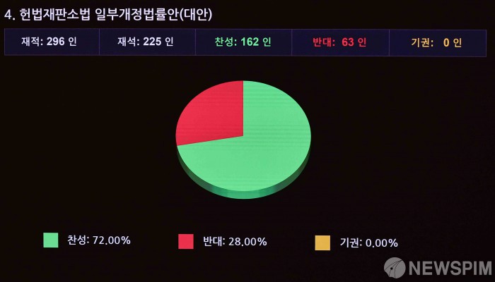 [서울=뉴스핌] 윤창빈 기자 = 27일 오후 서울 여의도 국회에서 열린 본회의에서 헌법재판소법 일부개정법률안(대안)이 가결되고 있다. 2026.02.27 pangbin@newspim.com
