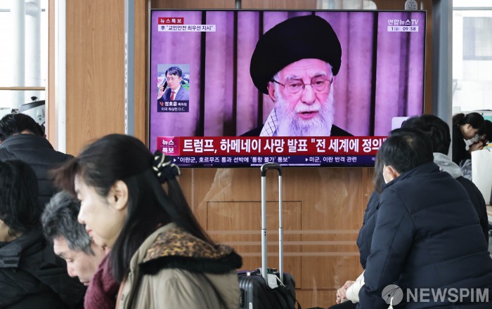 [서울=뉴스핌] 양윤모 기자 = 1일 오전 서울 용산구 서울역 대합실을 찾은 시민들이 美·이스라엘의 對이란 공격으로 인한 하메네이 사망방송을 시청하고 있다.2026.03.01 yym58@newspim.com