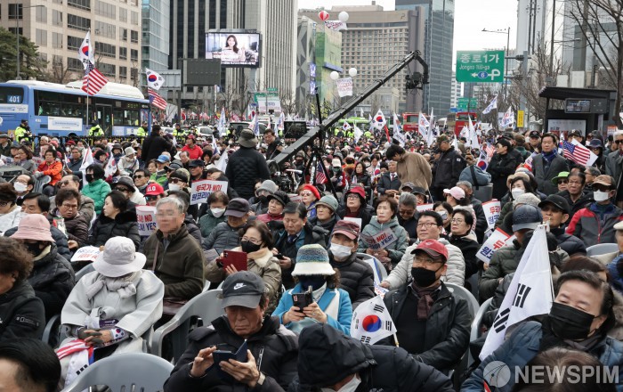 [서울=뉴스핌] 양윤모 기자 = 제107주년 3·1절인 1일 오후 보수단체 집회인 원코리아 범국민대회가 서울 광화문 동화면세점 앞에서 열렸다. 2026.03.01 yym58@newspim.com