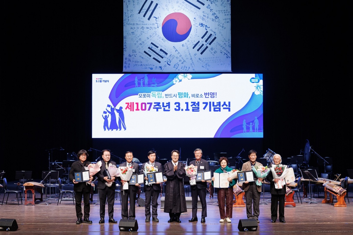 1일 오전 수원특례시 경기아트센터에서 개최된 제107주년 3·1절 기념식에서 김동연 경기도지사와 독립유공 표창 수상자들이 기념촬영을 하고 있다. [사진=경기도]