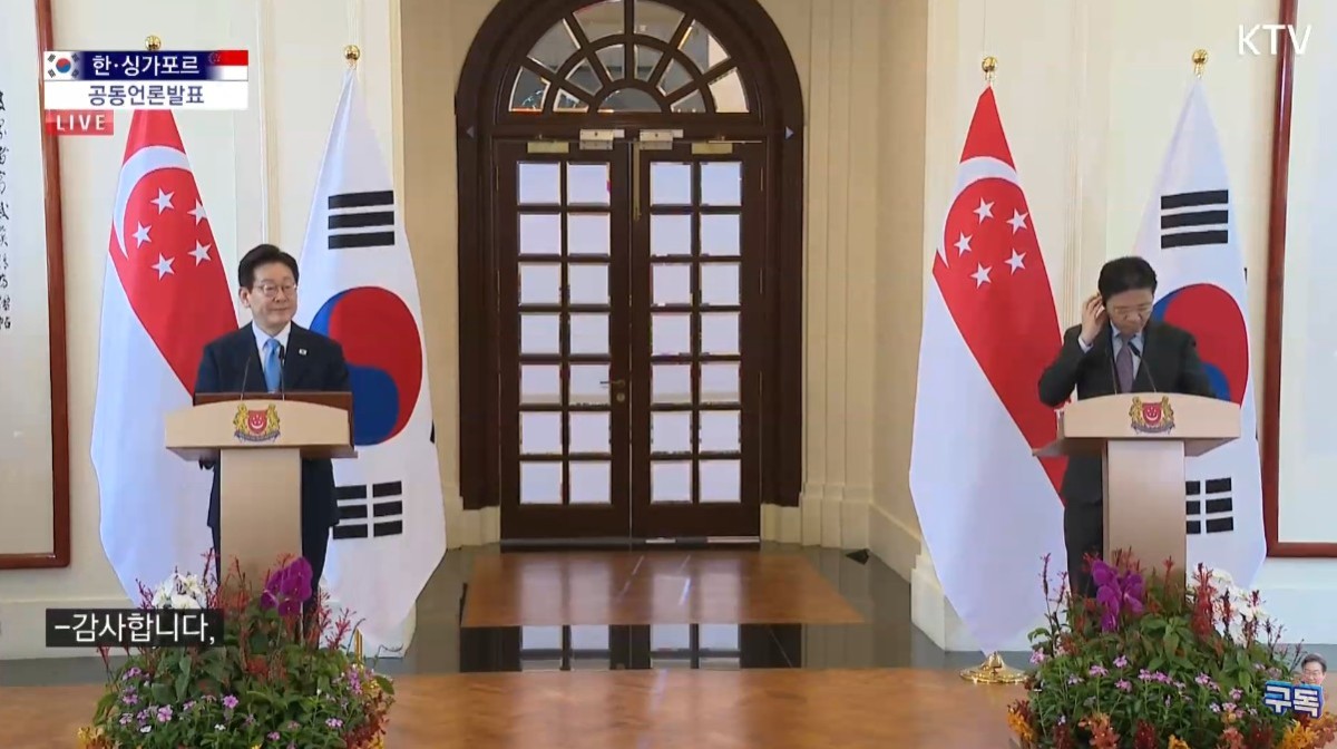 [서울=뉴스핌] 김미경 기자 = 싱가포르를 국빈 방문 중인 이재명 대통령은 2일(현지시간) "한-싱가포르 정상회담에서 로렌스 웡 총리님과 저는 최근 중동 상황에 대해서 논의했다"며 "우리는 중동 정세가 글로벌 안보와 에너지 공급망 등 글로벌 경제에 미치는 영향을 평가하고, 중동의 안정과 평화가 회복되기를 바란다는데 의견을 같이 했다"고 밝혔다.