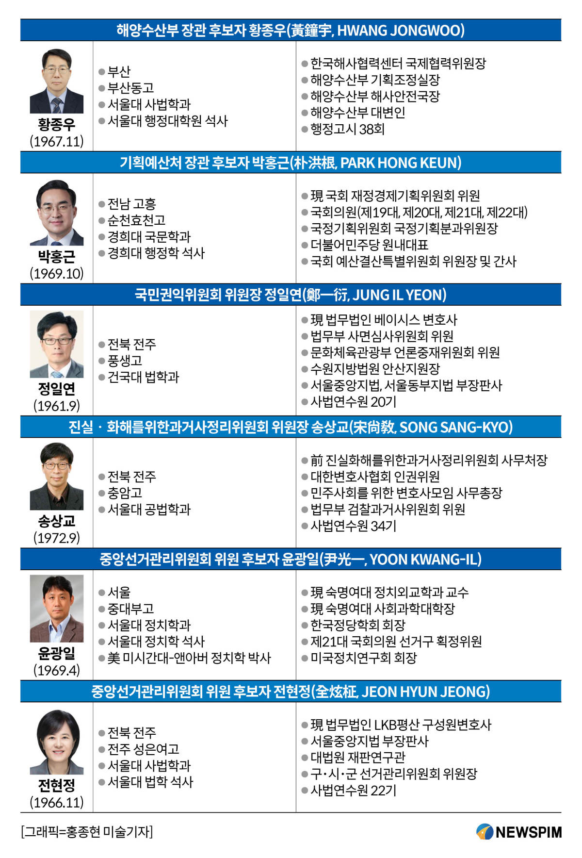 중앙선관위 위원 후보자로 윤광일 숙명여대 정치외교학과 교수와 전현정 변호사가 각각 지명됐다. 윤 교수는 선거제도 개혁방안을 연구해온 전문가로 공정한 선거관리와 선거제도 개혁을 이끌 적임자로 주목 받는다. 전 변호사는 서울 중앙지법 부장판사 등 20년 넘게 법복을 입은 법률가다. 민주주의 근간인 선거관리에 신뢰 높일 적임자라고 이 수석은 소개했다.