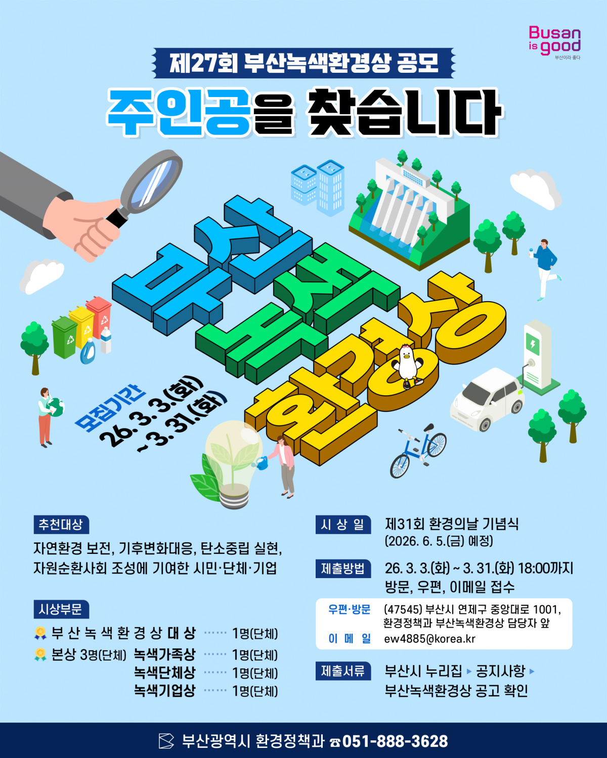 올해 27회를 맞는 부산녹색환경상은 지역 환경분야 최고 권위의 상으로, 개인(가족), 단체, 기업 3개 부문에서 본상 3명과 대상을 뽑아 부산광역시장 상패를 수여한다.