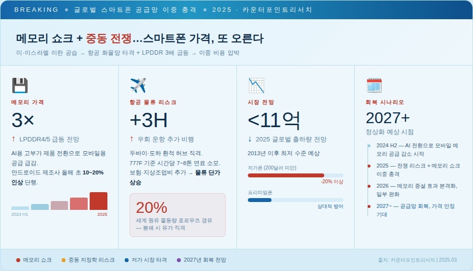 [서울=뉴스핌] 서영욱 기자 = 미국과 이스라엘의 이란 공습 이후 중동 긴장이 고조되면서 글로벌 스마트폰 공급망에 또 하나의 변수가 더해졌다. 메모리 가격 급등으로 이미 단말기 가격 인상 압력이 커진 상황에서 유가와 항공 운송비 상승까지 겹치고 있다. 부품과 물류 비용이 동시에 오르면서 제조사들의 마진 방어 여력은 빠르게 줄어드는 흐름이다. 업계에서는 스마트폰 가격이 한 차례 더 조정될 가능성을 배제하기 어렵다는 관측이 나온다.