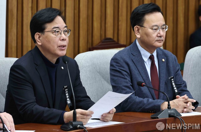 [서울=뉴스핌] 윤창빈 기자 = 송언석 국민의힘 원내대표가 3일 오전 서울 여의도 국회에서 열린 원내대책회의에서 모두발언을 하고 있다. 2026.03.03 pangbin@newspim.com