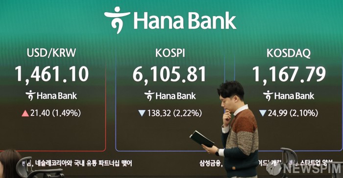 [서울=뉴스핌] 양윤모 기자= 미국과 이스라엘의 이란 공습 이후 3일 오전 코스피가 전장 종가보다 138.32 포인트(2.22%) 하락하며 6105.81로, 코스닥은 24.99 포인트(2.10%) 하락한 1167.79로 거래를 시작한 가운데, 서울 중구 하나은행 을지로본점 딜링룸에서 직원들이 업무를 보고 있다. 서울외환시장에서 달러/원 환율은 전장 대비 21.40원 상승한 1461.10원에 주간거래를 시작했다. 2026.03.03 yym58@newspim.com