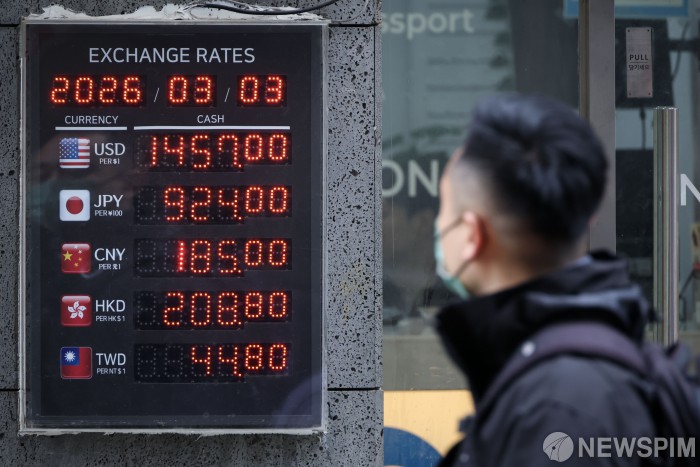 [서울=뉴스핌] 이건주 인턴기자 = 중동 정세 불안으로 달러화 강세가 이어지는 3일 오전 서울 중구 명동 거리 환전소에 달러/원 환율이 표시되고 있다. 2026.03.03 kunjoo@newspim.com