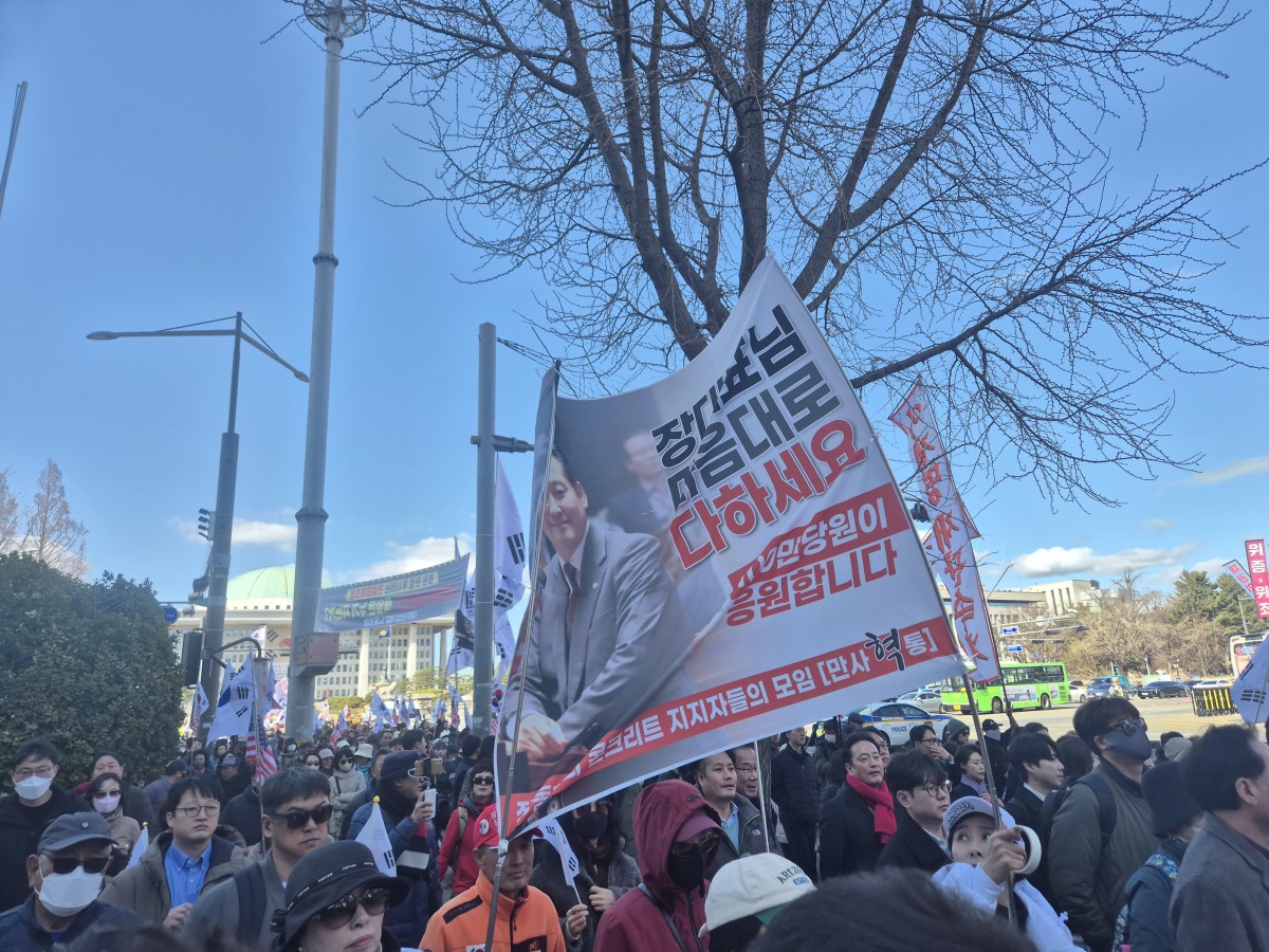 대열에는 당 공식 피켓과 함께 '윤어게인(Yoon again)' 문구가 적힌 팻말을 든 일부 참가자들도 보였다. 이들은 "윤 어게인"을 외치며 별도의 구호를 이어갔다.