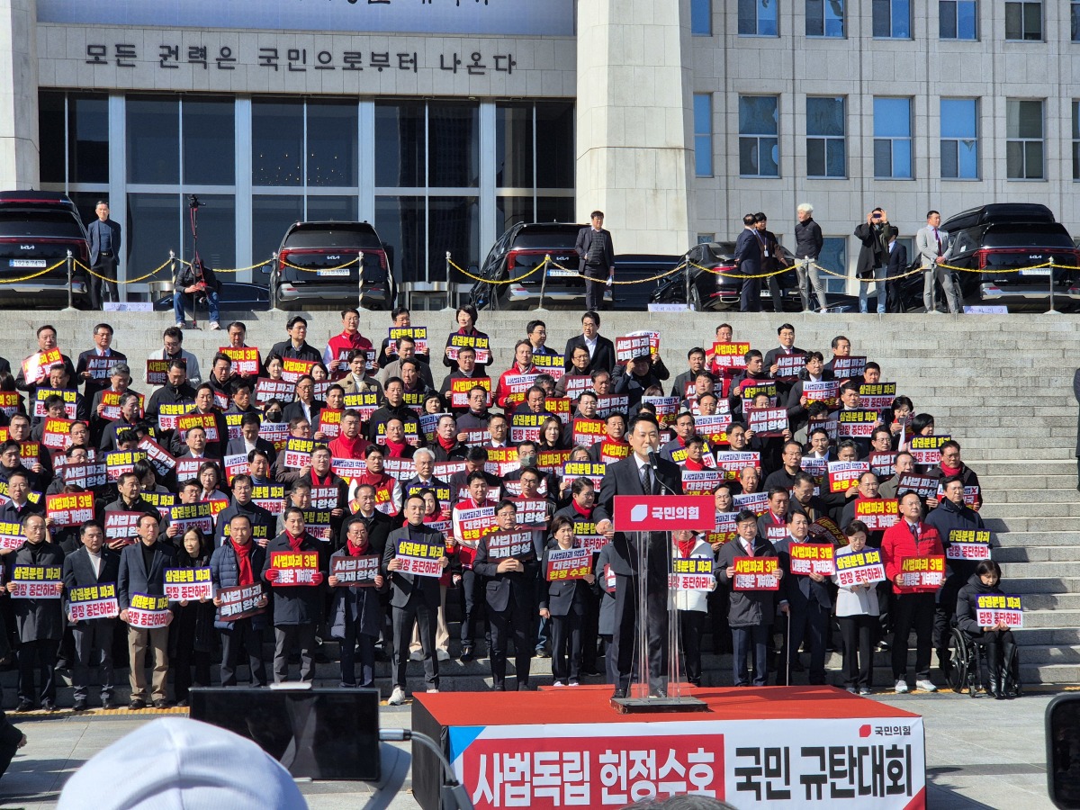 이날 출정식에서는 '삼권분립 파괴 중단', '사법파괴 3법 거부' 구호가 이어졌고, 행진 과정에서는 지도부를 향한 응원과 일부 지지자들의 항의성 목소리도 함께 나왔다.