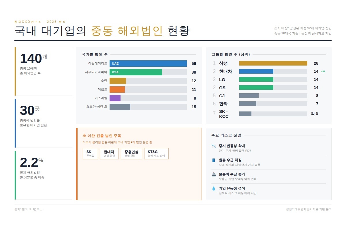 조사 결과 92개 그룹이 중동 10개국에 세운 해외법인은 140곳으로 집계됐다. 이는 전체 해외법인 6362곳의 2.2% 수준이다. 비중은 크지 않지만 원유 수입 의존도가 높은 국내 산업 구조를 고려하면 중동 정세 변화에 대한 영향은 적지 않다는 분석이 나온다.