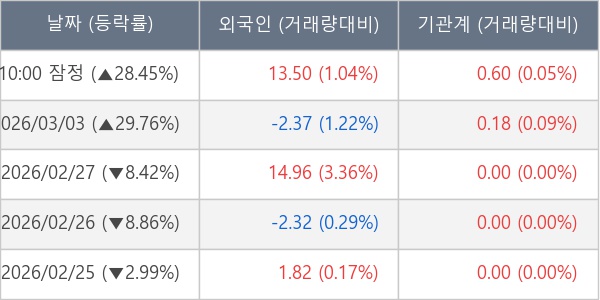 [서울=뉴스핌] 로보뉴스 = 04일 10시 15분 현재 흥구석유(024060)는 전일 대비 28.45% (현재가 29,350원) 상승했고, 기관이 최근 5일 연속 순매수(누적 7,808주, 잠정) 행진을 하고 있다.