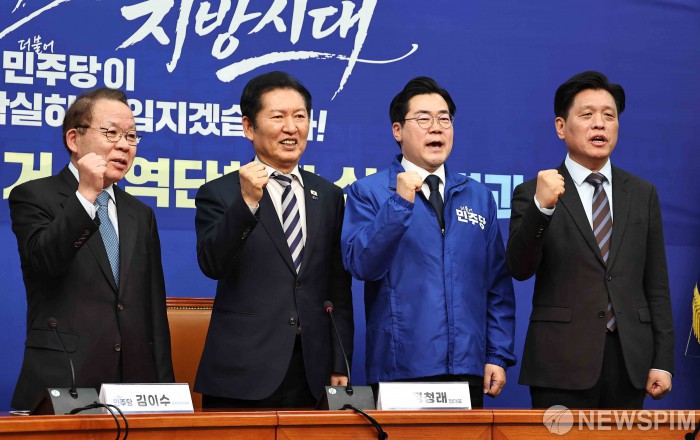 [서울=뉴스핌] 윤창빈 기자 = 정청래 더불어민주당 대표가 4일 오전 서울 여의도 국회에서 6·3 지방선거 인천시장 후보에 단수 공천한 박찬대 의원과 기념촬영을 하고 있다. 왼쪽부터 김이수 민주당 중앙당 공천관리위원장, 정 대표, 박 의원, 조승래 사무총장. 2026.03.04 pangbin@newspim.com