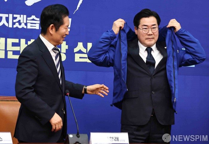 [서울=뉴스핌] 윤창빈 기자 = 정청래 더불어민주당 대표가 4일 오전 서울 여의도 국회에서 6·3 지방선거 인천시장 후보에 단수 공천한 박찬대 의원에게 당 점퍼를 입혀주고 있다. 2026.03.04 pangbin@newspim.com