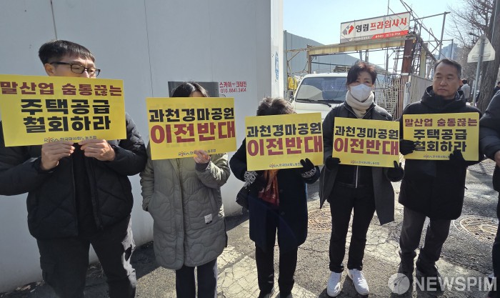 [서울=뉴스핌] 양윤모 기자= 정부의 1.29 부동산 졸속 대책에 반대하는 용산 국제업무지구·과천경마공원·태릉골프장 공동대응 관계자들의 집회가 4일 서울 용산구 용산국제업무지구 정문에서 진행됐다. 2026.03.04 yym58@newspim.com