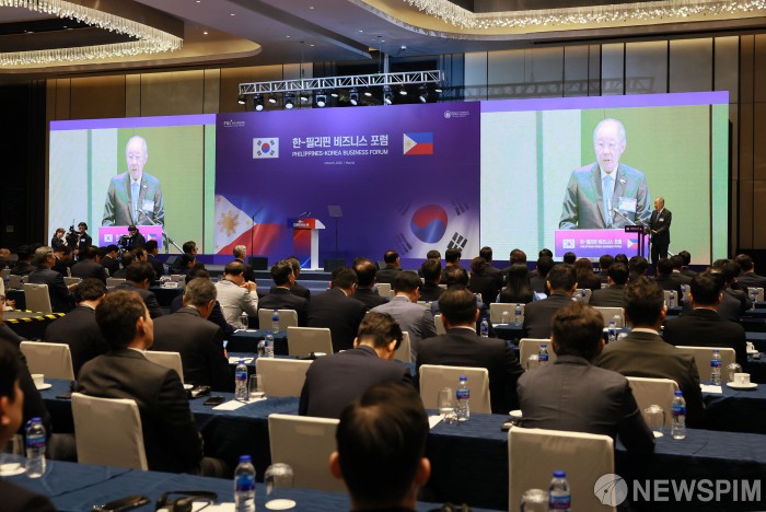[서울=뉴스핌]류진 한국경제인협회 회장이 4일 필리핀 콘래드 마닐라호텔에서 열린 '한-필리핀 비즈니스 포럼'에 참석해 인사말을 하고 있다.이날 포럼에는 이재명 대통령과 필리핀 페르디난드 마르코스 주니어 대통령을 비롯해 양국 기업인과 정부 인사 등 250여명이 참석했다.[사진=한국경제인협회] 2026.03.04 photo@newspim.com
