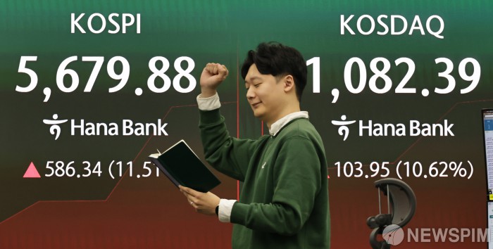 [서울=뉴스핌] 양윤모 기자= 뉴욕증시가 美·이란 접촉설에 반등한 가운데 5일 오전 코스피가 전장 종가보다 586.34 포인트(11.51%) 상승하며 5679.88로, 코스닥은 103.95포인트(10.26%) 상승한 1082.39로 거래를 시작한 가운데, 서울 중구 하나은행 을지로본점 딜링룸에서 직원들이 업무를 보고 있다. 서울외환시장에서 달러/원 환율은 전장 대비 15.20원 하락한 1461.00원에 주간거래를 시작했다. 2026.03.05 yym58@newspim.com