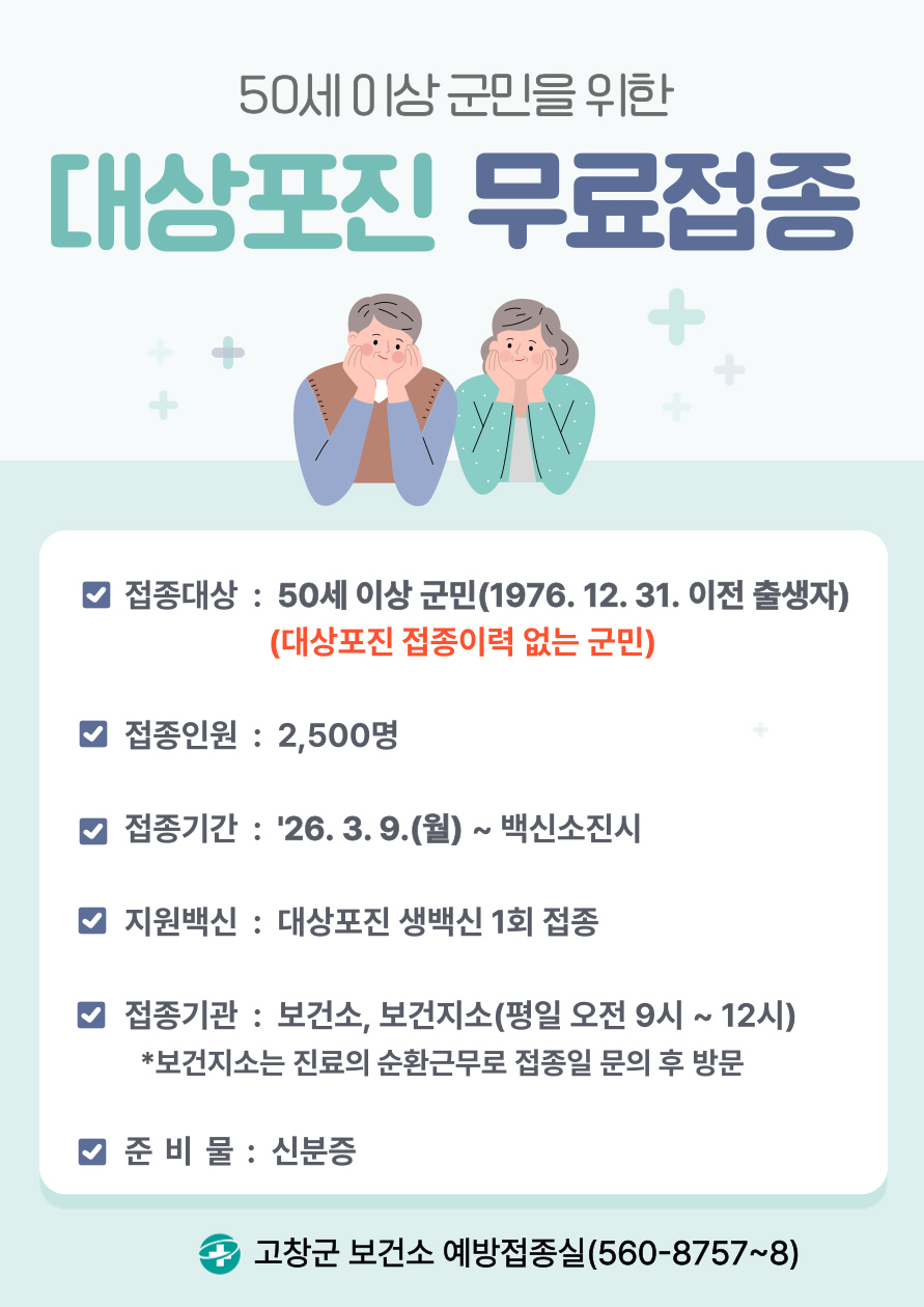 군은 대상포진 접종 이력이 없는 50세 이상 군민(1976년 12월 31일 이전 출생자)을 대상으로 생백신 1회 접종을 지원한다. 다만 기존에 대상포진 백신을 접종했거나 대상포진 진단 후 완치 1년이 지나지 않은 경우는 제외된다.