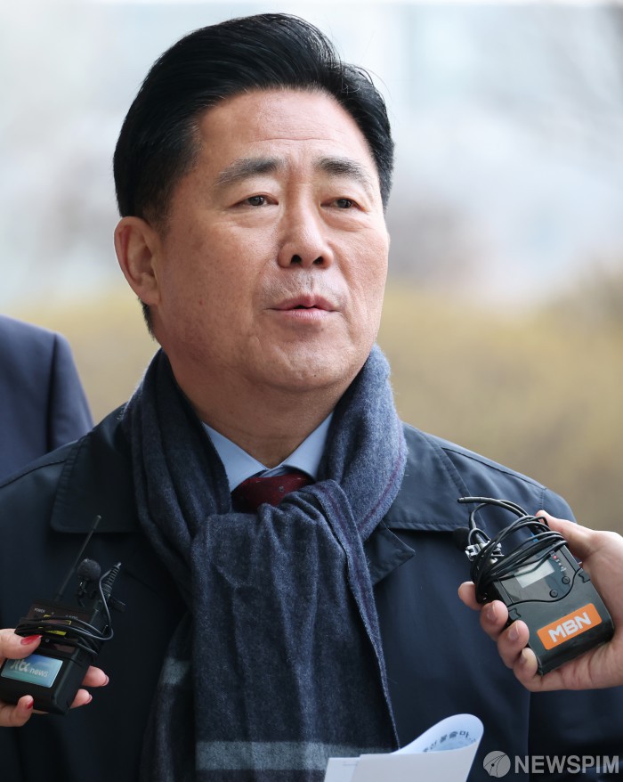[서울=뉴스핌] 김현우 기자 = 통일교 금품 수수 의혹을 받는 김규환 전 미래통합당(국민의힘 전신) 의원이 5일 오전 서울 서초구 서울고등검찰청에 마련된 정교유착 비리 의혹을 수사하는 검경 합동수사본부에 조사를 받기 위해 출석하며 취재진 질문에 답하고 있다. 2026.03.05 khwphoto@newspim.com