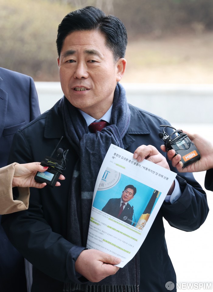 [서울=뉴스핌] 김현우 기자 = 통일교 금품 수수 의혹을 받는 김규환 전 미래통합당(국민의힘 전신) 의원이 5일 오전 서울 서초구 서울고등검찰청에 마련된 정교유착 비리 의혹을 수사하는 검경 합동수사본부에 조사를 받기 위해 출석하며 취재진 질문에 답하고 있다. 2026.03.05 khwphoto@newspim.com