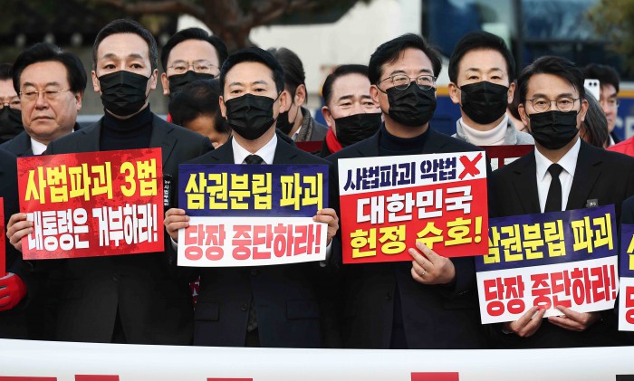 송언석 원내대표는 이날 "오늘 국무회의에서 사법 파괴 3대 악법을 공포한다는 것은 대한민국의 법치주의를 완전히 부정하는 것"이라며 "대한민국의 헌법 질서를 완전히 무너뜨리는 것"이라고 강조했다.