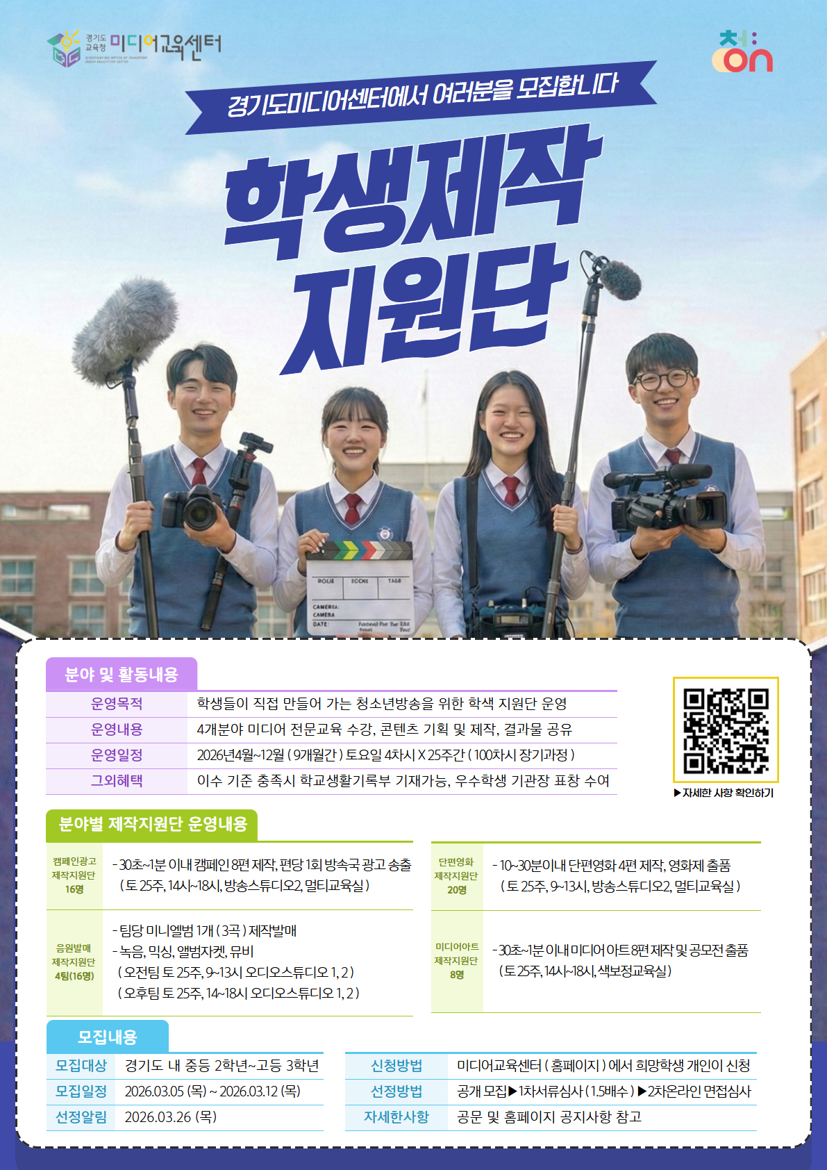 교육센터는 이 프로그램을 통해 학생들이 협동하여 실습형 콘텐츠를 제작함으로써 미디어 활용 능력을 향상시키고 진로를 탐색할 기회를 제공한다. 모집 분야는 ▲캠페인 광고 제작지원단(16명) ▲단편영화 제작지원단(20명) ▲음원발매 제작지원단(16명) ▲미디어아트 제작지원단(8명) 등이다.