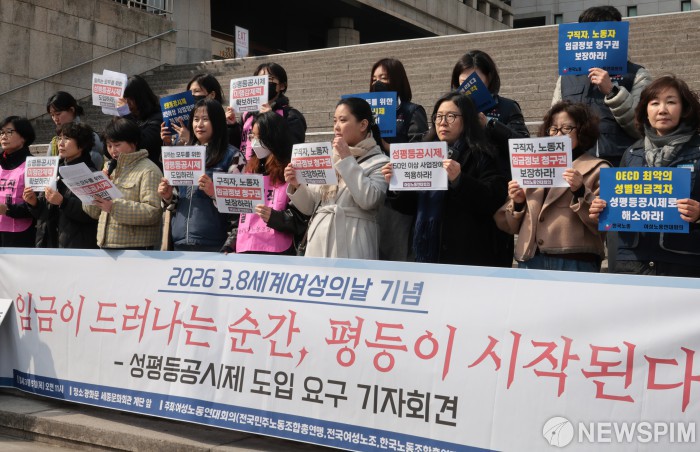 [서울=뉴스핌] 이길동 기자 = 여성 노동 연대회의 관계자들이 5일 오전 서울 종로구 세종문화회관 계단 앞에서 제118주년 3·8 세계 여성의 날 기념 '임금이 드러나는 순간, 평등이 시작된다' 성평등 공시제 도입 요구 기자회견을 하고 있다. 2026.03.05 gdlee@newspim.com