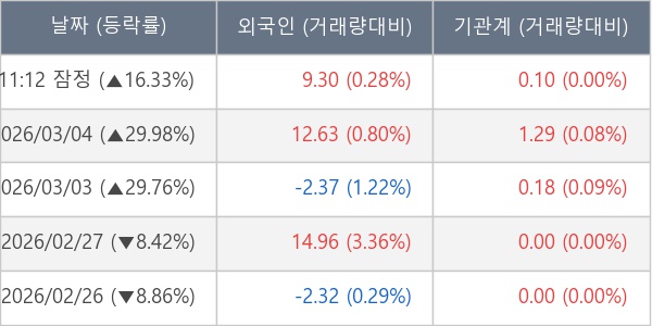 [서울=뉴스핌] 로보뉴스 = 05일 11시 30분 현재 흥구석유(024060)는 전일 대비 16.33% (현재가 34,550원) 상승했고, 기관이 최근 6일 연속 순매수(누적 15,680주, 잠정) 행진을 하고 있다.