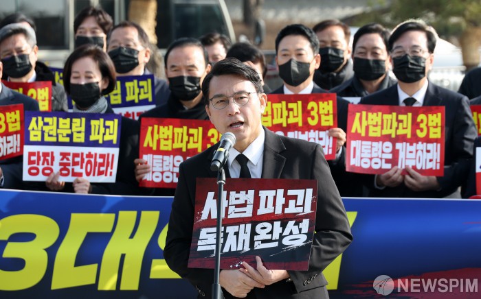 [서울=뉴스핌] 정일구 기자 = 윤상현 국민의힘 의원이 5일 오전 서울 종로구 청와대 분수대 앞에서 열린 현장 의원총회에서 모두발언을 하고 있다. 2026.03.05 mironj19@newspim.com