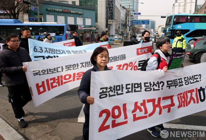 [서울=뉴스핌] 이건주 인턴기자 = 5일 오전 서울 영등포역 일대에서 '2026 지방선거 정치개혁 촉구 시민대행진' 참가자들이 국회를 향해 거리 행진을 하고 있다. 이번 행사는 지방선거의 비례성과 대표성을 높이기 위한 정치권의 결단을 요구하기 위해 마련됐다. 2026.03.05 kunjoo@newspim.com