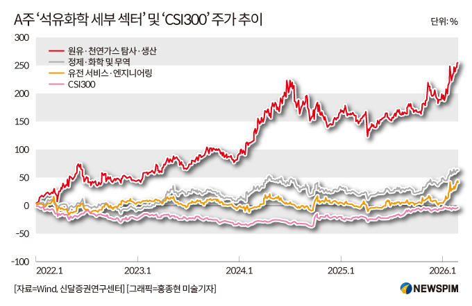 중국 금융정보 제공업체 윈드(Wind)에 따르면 2026년 2월 27일까지 기준 원유·천연가스 탐사·생산 섹터는 2022년 이래 250.38% 올랐고, 같은 기간 정제·화학 및 무역 섹터는 62.26%, 유전 서비스·엔지니어링 섹터는 41.62% 상승했다.