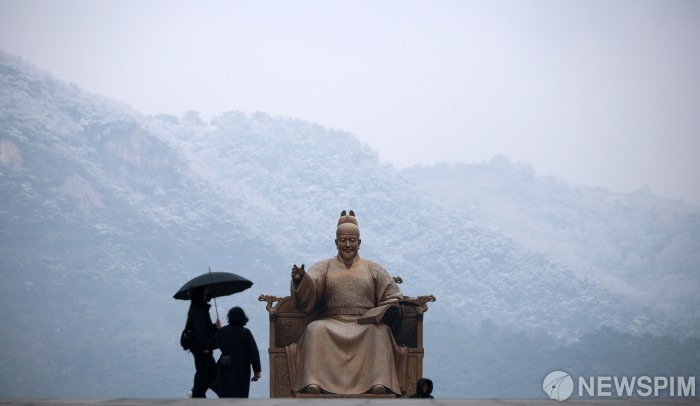 [서울=뉴스핌] 이건주 인턴기자 = 전날 내린 비가 그친 뒤 기온이 급락하며 갑작스러운 눈비가 내리는 6일 오전 서울 종로구 광화문 광장에서 우산을 쓴 시민이 발걸음을 옮기고 있다. 2026.03.06 kunjoo@newspim.com
