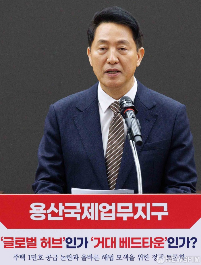 [서울=뉴스핌] 윤창빈 기자 = 오세훈 서울시장이 6일 오후 서울 여의도 국회 의원회관에서 열린 용산국제업무지구 '글로벌 허브'인가 '거대 베드타운'인가?' 정책 토론회에서 축사를 하고 있다. 2026.03.06 pangbin@newspim.com