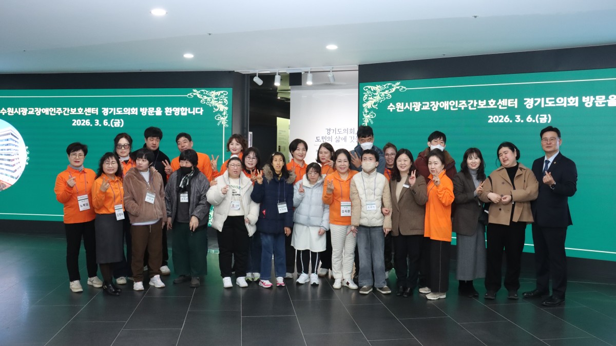 수원시광교장애인주간보호센터 이용자와 박희붕외과 자원봉사단 회원들을 환영하며 소통의 시간을 가졌다. [사진= 경기도의회]
