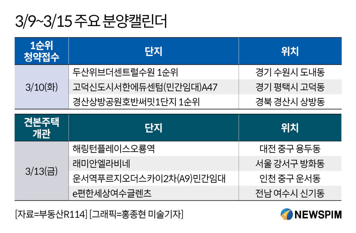 이 주에는 경기 수원시 장안구 영화동 두산위브더센트럴수원, 경북 경산시 상방동 경산상방공원호반써밋1단지 등에서 청약을 진행한다.