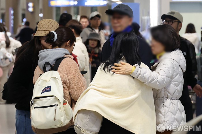 [영종도=뉴스핌] 이형석 기자 = 두바이에 여행을 떠났다 중동 전쟁으로 발이 묶였던 여행객이 6일 인천공항을 통해 귀국했다. 여행객이 가족들과 재회하고 있다. 2026.03.06 leehs@newspim.com