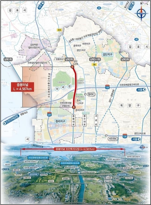 [인천=뉴스핌] 홍재경 기자 =인천 서부지역 경인아라뱃길과 공항고속도로를 가로질러 남북 간을 잇는 중봉터널이 건설된다.