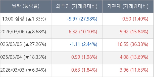 [서울=뉴스핌] 로보뉴스 = 09일 10시 15분 현재 태웅(044490)은 전일 대비 1.33% (현재가 38,050원) 상승했고, 기관이 최근 6일 연속 순매수(누적 35.03만 주, 잠정) 행진을 하고 있다.