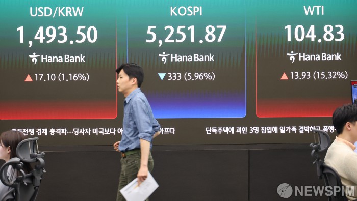 [서울=뉴스핌] 류기찬 기자 = 코스피가 300포인트 넘게 급락 마감한 9일 오후 서울 중구 하나은행 딜링룸 전광판에 달러/원, 코스피 지수, 서부텍사스산 원유 선물이 표시되고 있다. 이날 달러/원 환율은 전 거래일 대비 19.10원 오른 1495.50원에, 코스피 지수는 333.00포인트(5.96%) 내린 5251.87에, 코스닥 지수는 52.39포인트(4.54%) 내린 1102.28에 장을 마감했다. 2026.03.09 ryuchan0925@newspim.com