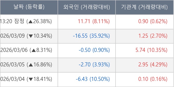 [서울=뉴스핌] 로보뉴스 = 10일 13시 30분 현재 오이솔루션(138080)은 전일 대비 26.38% (현재가 25,100원) 상승했고, 기관이 최근 5일 연속 순매수(누적 10.93만 주, 잠정) 행진을 하고 있다.