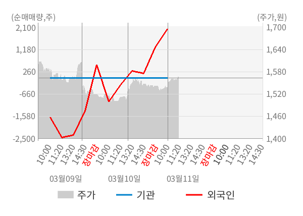 [서울=뉴스핌] 로보뉴스 = 11일 10시 15분 현재 신스틸(162300)은 전일 대비 2.76% (현재가 1,566원) 상승했고, 외국인이 최근 6일 연속 순매수(누적 12,555주, 잠정) 행진을 하고 있다.