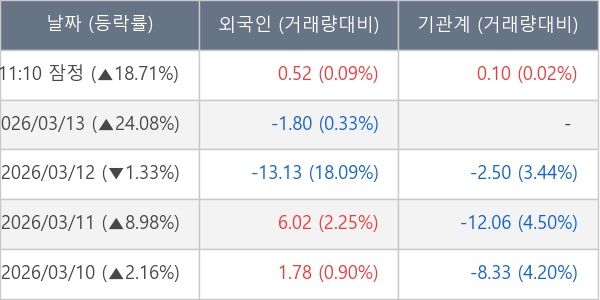 [서울=뉴스핌] 로보뉴스 = 16일 11시 30분 현재 RF시스템즈(474610)는 외국인과 기관이 각각 0.52 만 주, 0.10 만 주 순매수(잠정) 하면서 전일 대비 18.71% (현재가 11,990원) 상승하고 있다.