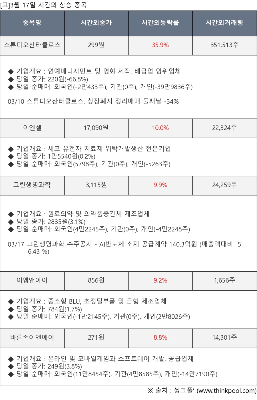 [서울=뉴스핌] 로보뉴스 = 3월 17일, 인공지능 투자비서 ‘AI라씨로’는 시간외 단일가 매매에서 주가가 크게 변동한 스튜디오산타클로스(204630), 이엔셀(456070) 등의 최근 동향을 분석해서 발표했다.