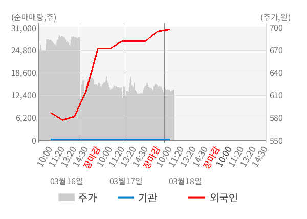 [서울=뉴스핌] 로보뉴스 = 18일 10시 15분 현재 뉴온(123840)은 전일 대비 1.15% (현재가 617원) 상승했고, 외국인이 최근 5일 연속 순매수(누적 49,114주, 잠정) 행진을 하고 있다.