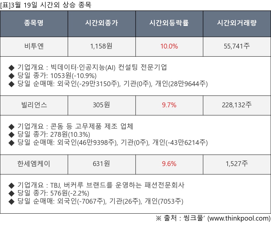 [표]3월 19일 시간외 상승 종목 및 최근 동향